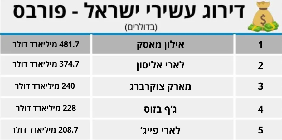אילון מאסק, שהודח לרגע בראש הרשימה על ידי לארי אליסון, פותח פער משמעותי עם הון המוערך בשווי של 481.7 מיליארד דולר, ירידה קלה משבוע שעבר אז עמד הונו על 485.6 מיליארד דולר. מדובר בשבוע נוסף של ירידות עבור מנכ"ל טסלה.