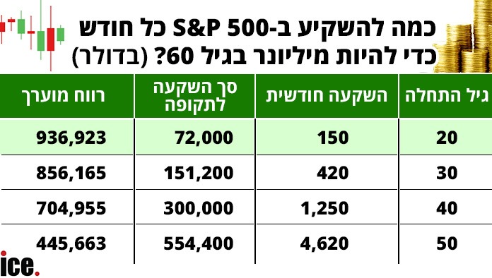 והכי מדהים - מי שמתחיל כבר בגיל 20, אפילו עם סכום קטן של 150 דולר בחודש, יכול להפוך למיליונר בגיל 60 כמעט בלי להרגיש. סך ההפקדה לאורך 40 שנה יהיה רק כ-72 אלף דולר, והשוק יעשה את השאר. כל זה בזכות הכוח האדיר של הזמן והריבית שממשיכה להרוויח על עצמה שוב ושוב.