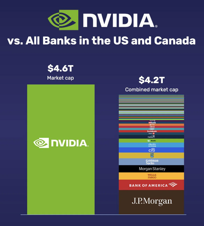 אם עוד היה צורך בהוכחה לכמה עמוק חדרה הבינה המלאכותית לשוק ההון - הנתון הבא עושה את העבודה: שווי השוק של אנבידיה טיפס לאחרונה מעל 5 טריליון דולר, אך עוד לפני כן עקפה יצרנית השבבים את השווי הכולל של כל הבנקים הגדולים בארצות הברית ובקנדה גם יחד - כולל שמות כמו ג'יי.פי. מורגן, גולדמן זאקס, בנק אוף אמריקה, רויאל בנק אוף קנדה ועוד.