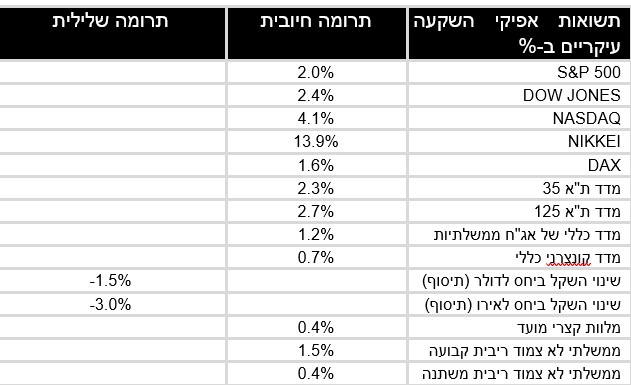 בארה"ב נרשמה מגמה חיובית, כאשר מדד הדאו עלה ב-2.4%, מדד ה-S&P עלה ב-2.0% ואילו מדד הנאסד"ק עלה בשיעור חד של 4.1%. בנוסף, באירופה נרשמו עליות שערים: ה-DAX הגרמני עלה ב-1.6%, ה-CAC הצרפתי עלה ב-3.3% וה-Eurostoxx 50 עלה ב-3.0%. מדד הניקיי ביפן עלה בשיעור חד במיוחד של 13.9%. המדד העולמי של השווקים המתפתחים עלה אף הוא בשיעור של 4.9%. כל אלו במונחי מטבע של אותן מדינות.