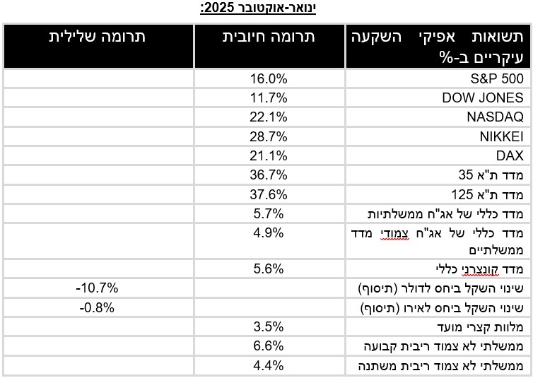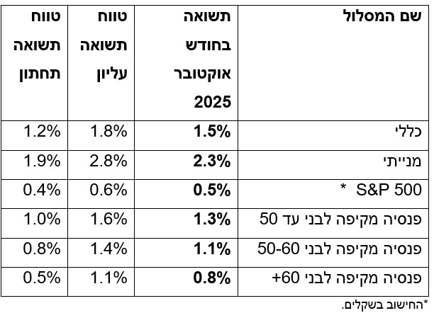 בחודש אוקטובר נרשמו עליות שערים במניות בישראל ובעולם, ובאיגרות החוב הקונצרניות והממשלתיות בישראל מה שתרם לתשואה החיובית של הקופות. מנגד, היחלשות המט"ח גרעה כ-0.3% מתשואות הקופות. שוקי המניות בעולם הציגו עליות שערים (עד ה-30.10 שהוא היום האחרון לסגירת החודש במרבית קופות הגמל).