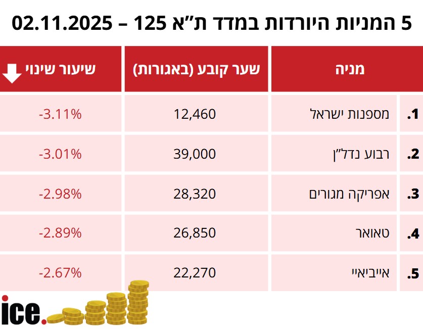 בקרב חמש המניות היורדות, המפסידה היא חברת מספנות ישראל שמנייתה ירדה ב-3.11% לרמה של 12,460 אגורות. מנייתה של חברת רבוע נדל"ן פחתה ב-3.01% לרמה של 39,000 אגורות.