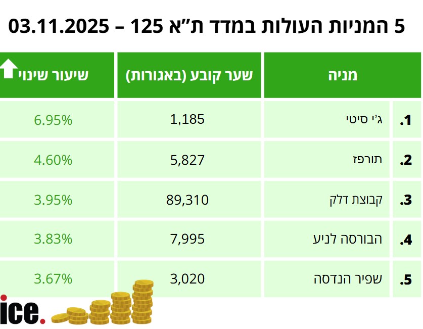 הבורסה לניירות ערך בתל אביב נסגרה עם עליות במדדים. מדד ת"א 35 עלה ב-0.98% לרמה של 3,320.54 נקודות ומדד ת"א 125 עלה ב-0.76% לרמה של 3,388.9 נקודות. בקרב חמש המניות העולות, המנצחת היא חברת ג'י סיטי שמנייתה עלתה ב-6.95% לרמה של 1,185 אגורות. מנייתה של חברת תורפז צמחה ב-4.60% לרמה של 5,827 אגורות.
