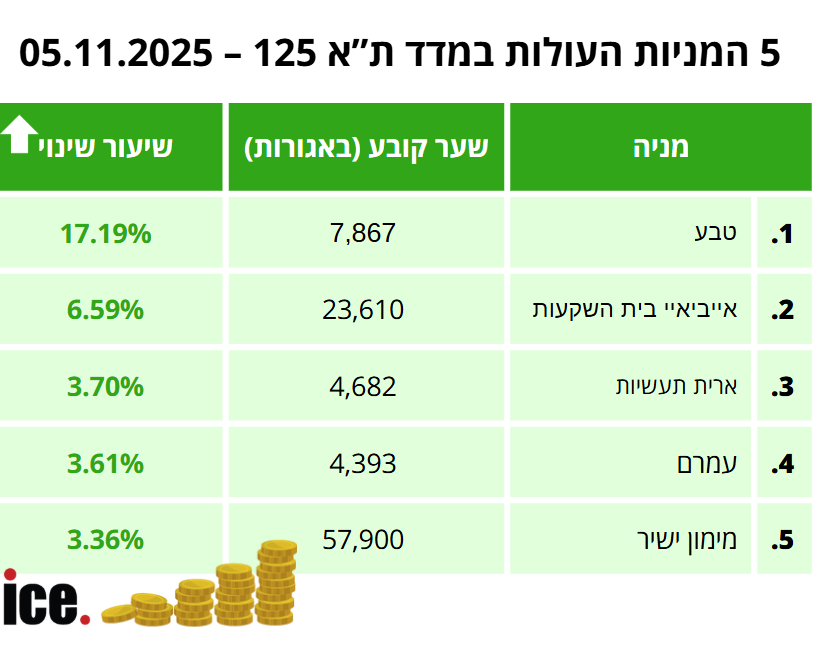 בקרב חמש המניות העולות, המנצחת היא חברת טבע שמנייתה צמחה ב-17.19% לרמה של 7,867 אגורות. מניית בית ההשקעות אייביאיי קפצה ב-6.59% לרמה של 23,610 אגורות.