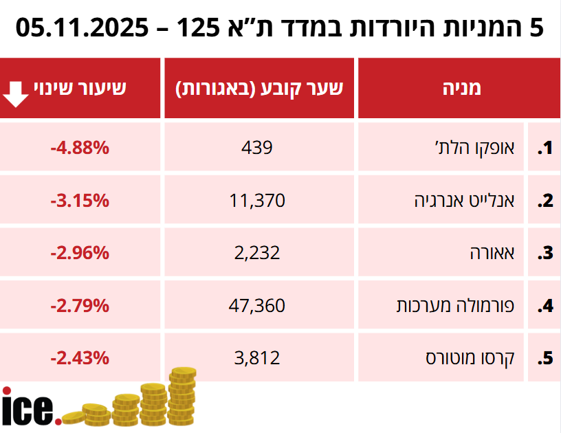 בקרב חמש המניות העולות, המפסידה היא חברת אופקו הלת' שמנייתה ירדה ב-4.88% לרמה של 439 אגורות. במקום השני, מופיעה מניית אנלייט אנרגיה צנחה ב-3.15% לרמה של 11,370 אגורות.