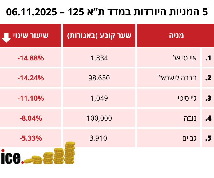 את רשימת המניות היורדות מובילות שתי החברות של עידן עופר איי סי אל שירדה בשיעור של 14.88% לרמה של 1,834 נקודות והחברה לישראל שירדה בשיעור של 14.24% לרמה של 98,650 נקודות. במקום השלישי נמצאת ג'י סיטי שירדה בשיעור של 11.10% לרמה של 1,049 נקודות. נובה רביעית לאחר שירדה בשיעור של 8.04% לרמה של 100,000 נקודות. גב ים סוגרת את החמישייה הראשונה עם ירידה של 5.33% לרמה של 3,910 נקודות.