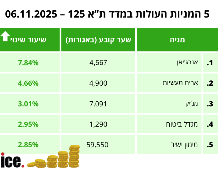בקרב המניות העולות של היום, מובילה אנרג'יאן עם עלייה של 7.84% לרמה של 4,567 נקודות. מיד אחריה ארית תעשיות שעלתה בשיעור של 4.66% לרמה של 4,900 נקודות. מי שנמצאת במקום השלישי היא מג'יק עם עלייה של 3.01% לרמה של 7,091 נקודות. מגדל ביטוח במקום הרביעי לאחר שעלתה בשיעור של 2.95% לרמה של 1,290 נקודות. מימון ישיר סוגרת את החמישייה הראשונה לאחר שירדה בשיעור של 2.85% לרמה של 59,550 נקודות.