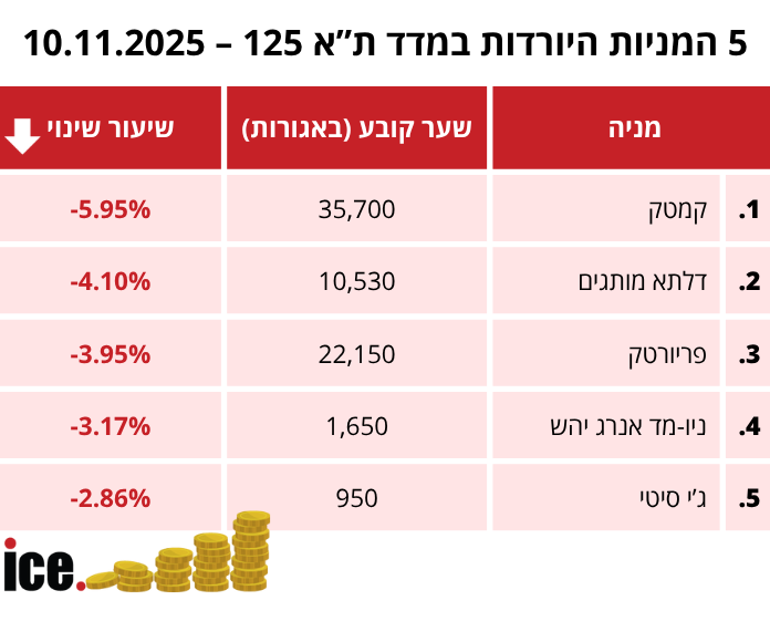 את רשימת המניות היורדות של היום מובילה קמטק שירדה בשיעור של 5.95% לרמה של 35,700 נקודות. במקום השני דלתא מותגים שירדה בשיעור של 4.10% לרמה של 10,530 נקודות. פריורטק מתייצבת במקום השלישי עם ירידה בשיעור של 3.95% לרמה של 22,150 נקודות. ניו-מד אנרג יהש במקום הרביעי לאחר שירדה ב-3.17% לרמה של 1,650 נקודות. ג'י סיטי סוגרת את הרשימה עם ירידה בשיעור של 2.86% לרמה של 950 נקודות.