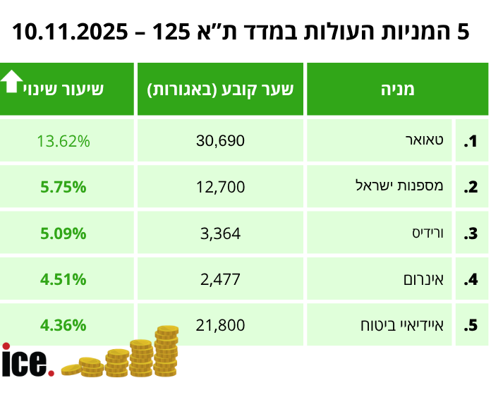בגזרת המניות, מי שטסה כלפי מעלה היא ענקית השבבים טאואר שפרסמה הבוקר את הדוחות הכספיים שלה לרבעון השלישי של השנה ועלתה בשיעור של 13.62% לרמה של 30,690. במקום השני נמצאת מספנות ישראל שעלתה בשיעור של 5.75% לרמה של 12,700 נקודות. מי שנמצאת במקום השלישי היא ורידיס לאחר שעלתה בשיעור של 5.09% לרמה של 3,364 נקודות. אינרום במקום הרביעי עם עלייה בשיעור של 4.51% לרמה של 2,477 נקודות. איידיאיי ביטוח סוגרת את החמישייה הראשונה עם עלייה בשיעור של 4.36% לרמה של 21,800 נקודות.