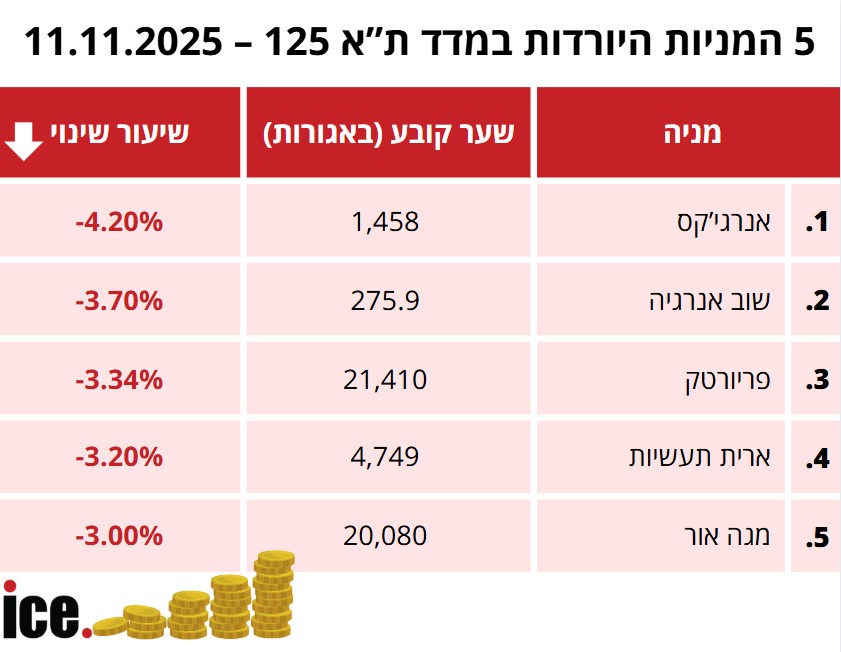 בקרב חמש המניות היורדות, המפסידה היא חברת אנרג'יקס שמנייתה צנחה ב-4.20% לרמה של 1,458 אגורות. מנייתה של חברת שוב אנרגיה ירדה ב-3.70% לרמה של 275.9 אגורות.