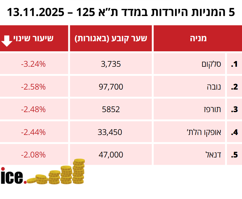 במסגרת 5 המניות היורדות הבולטות, חברת התקשורת סלקום נמצאת ראשונה כשרשמה ירידה של -3.24% לרמה של 3,735 אגורות, מי שנמצאת שנייה היא מניית נובה שירדה ב-2.58% לרמה של 97,700 אגורות.