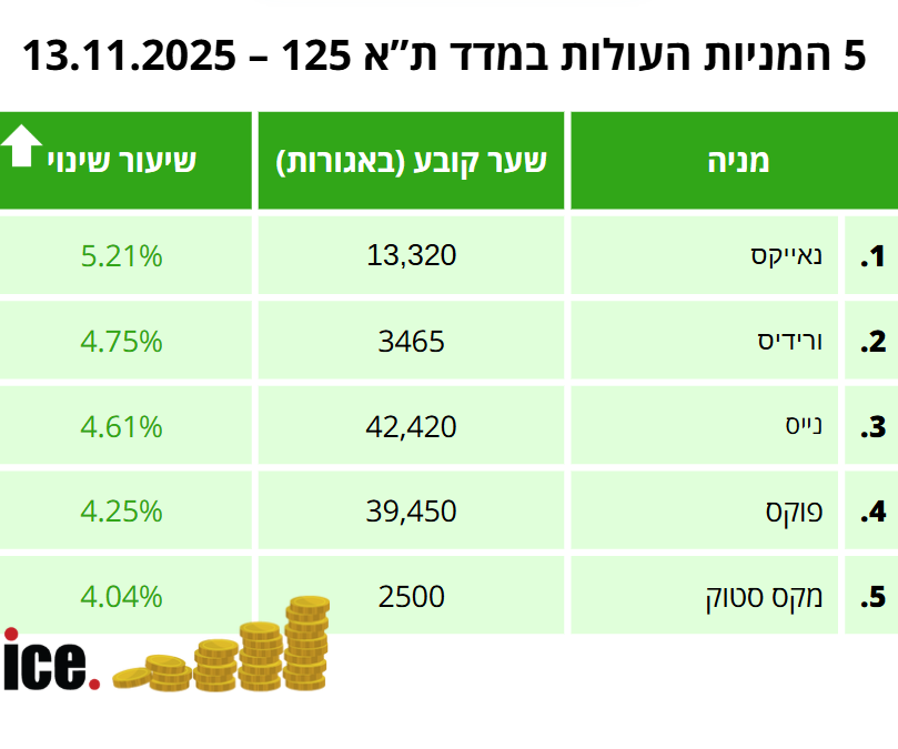 בקרב 5 המניות העולות אף מנייה מהמניות שזינקו אתמול לא נמצאת. נאייקס רשמה את העלייה הגדולה ביותר כאשר עלתה ב-5.21% לרמה של 13,320 אגורות, במקום השני נמצאת חברת ורידיס שעלתה ב-4.75% לרמה של 3465 אגורות.