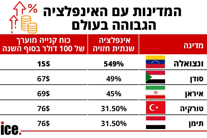 במצבים קיצוניים, כמו בונצואלה, מדברים כבר על היפר-אינפלציה - כשהמחירים מזנקים בקצב מסחרר שהופך את המטבע המקומי כמעט לחסר ערך. אלו המדינות בהן הכסף נשחק בקצב המהיר ביותר בעולם: