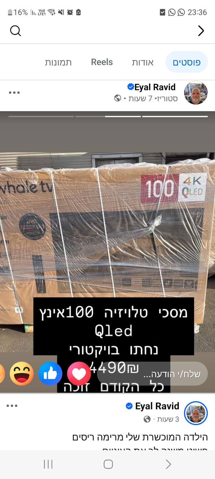 רביד העלה סטורי עם משאית ועליה משטח שלם עם סחורה מלאה בטלוויזיות בגודל 100 אינץ' וכתב: ''מסכי טלוויזיה 100 אינץ' קיו LED נחתו בוויקטורי ב-4490 שקל. כל הקודם זוכה''