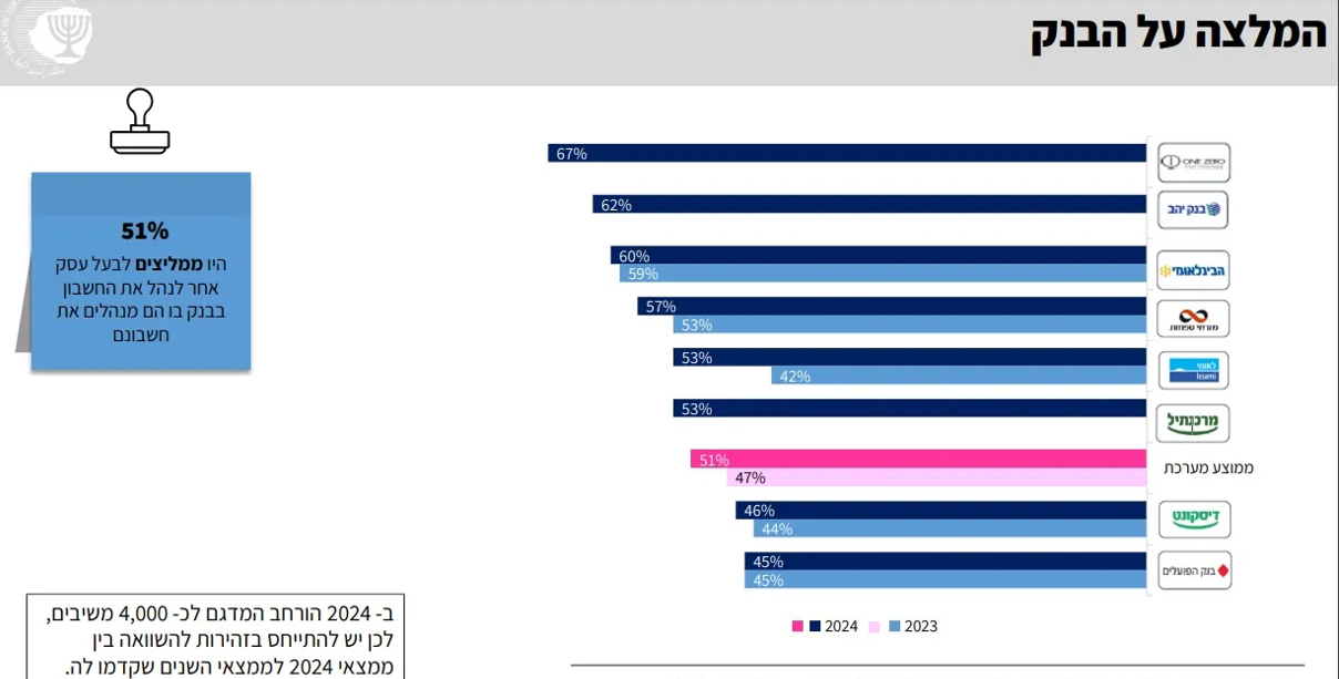 בכל הקשור לשביעות רצון - הנתונים אכן מפתיעים. בחודש מרץ האחרון פרסם בנק ישראל את סקר שביעות הרצון השנתי של ציבור העצמאים לישראל לשנת 2024, כאשר לראשונה גם בנק וואן זירו נכנס לסקירה. התוצאות: עם כניסתו הראשונה למדד, כבש הבנק את המקום הראשון בפער.