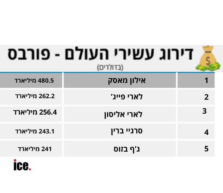 דירוג עשירי העולם של מגזין "פורבס" פורסם כמדי שבוע והביא עמו דרמות של ממש לצמרת הגבוהה שעוברת טלטלה. האיש העשיר ביותר בעולם, אילון מאסק, הבעלים שטסלה וטוויטר, רשם הכנסות עתק בדמות 18 מיליארד דולר, כאשר הונו האישי מוערך כעת ב-480.5 מיליארד דולר.