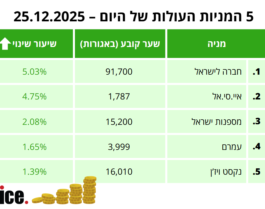 בקרב חמש המניות העולות, המנצחת היא חברה לישראל שמנייתה עלתה ב-5.03% לרמה של 91,700 אגורות. חברת איי.סי.אל שמנייתה צמחה ב-4.75% לרמה של 1,787 אגורות.