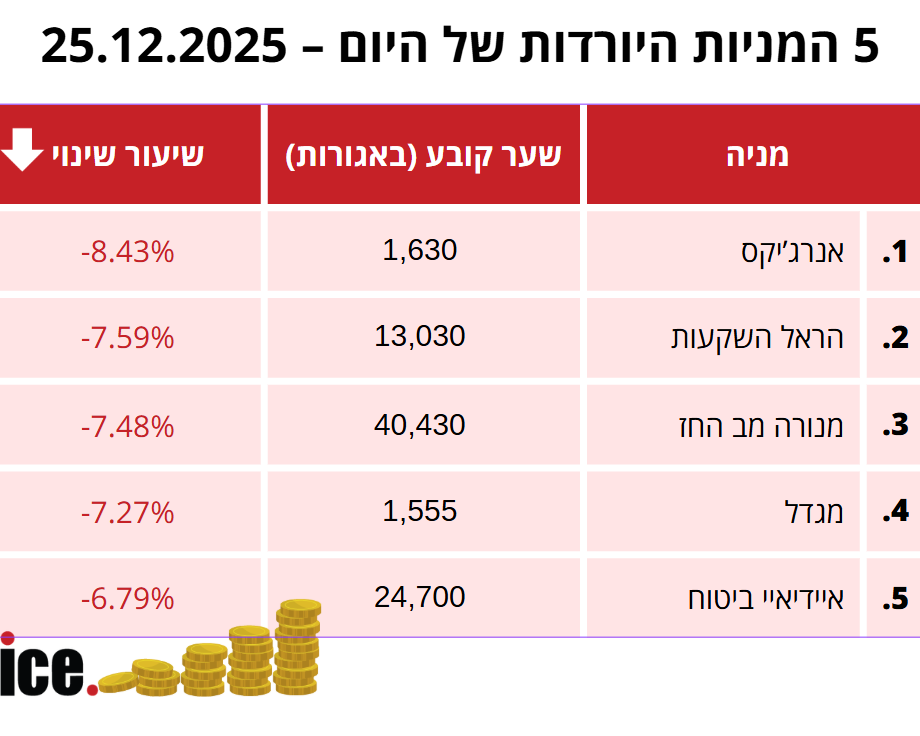 בקרב חמש המניות היורדות, מניית אנרג'יקס צנחה ב-8.43% לרמה של 1,630 אגורות. אחריה, ניצבת חברת הראל השקעות אשר מנייתה ירדה ב-7.59% לרמה של 13,030 אגורות.