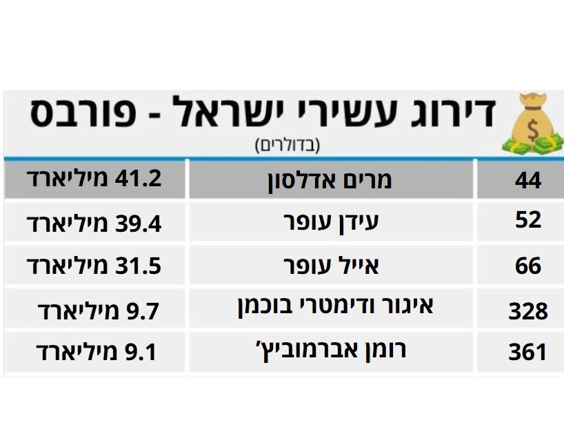 דירוג עשירי ישראל על פי מגזין "פורבס": מרים אדלסון שומרת על הפסגה אחרי שהכניסה סכומי עתק, עידן עופר חוגג רווחים של למעלה מ-2 מיליארד דולר. ומה עשה אחיו אייל עופר?