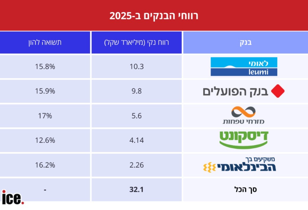 חמשת הבנקים הרוויחו 32.1 מיליארד שקל בשנת 2025, אך הקרב עם משרד האוצר על מס חדש מטלטל את המערכת כולה. איזה בנק הציג את הרווח הגדול ביותר ומי מוביל בתשואה להון?