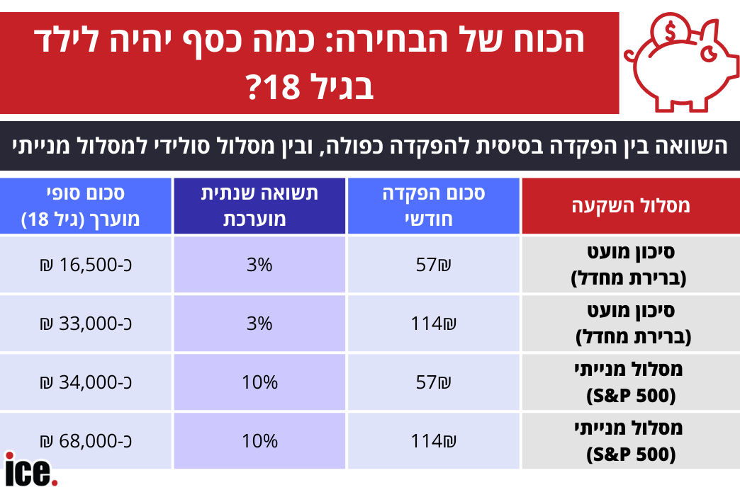 הצעד הראשון והחשוב ביותר הוא בסיסי לגמרי - להכפיל את ההפקדה. ההורים יכולים להוסיף 57 שקלים נוספים מדי חודש ולהעלות את הסכום ל-114 שקלים שמופקדים מדי חודש. מדובר בסכום קטן יחסית, אבל על פני 18 שנה, עם ריבית דריבית ובמסלול הנכון, ההשפעה על הסכום הסופי היא עצומה. מי שעדיין לא הפעיל את ההכפלה - זה הדבר הראשון שצריך לעשות, עוד לפני שמחליפים מסלול.