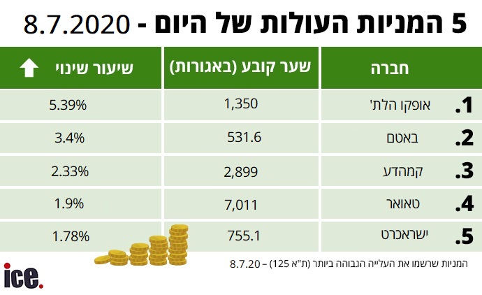 אופקו הלת' עולה היום ב-5.39% לשער של 1,350 אג'. אחריה, באטם עם עלייה של 3.4% שמביא אותה למחיר של 531.6 אג' למניה. קמהדע מוסיפה לערכה 2.33% ועם נעילת המסחר מנייתה נסגרת בשער של 2,899 אג'. במקום הרביעי, טאואר, שבמהלך יום המסחר עלתה ב-1.9% והגיעה לשער של 7,011 אג'. את העלייה החמישית בגובהה (1.78%) רשמה ישראכרט שבתום יום המסחר שער המניה שלה עמד על 755.1 אג'.