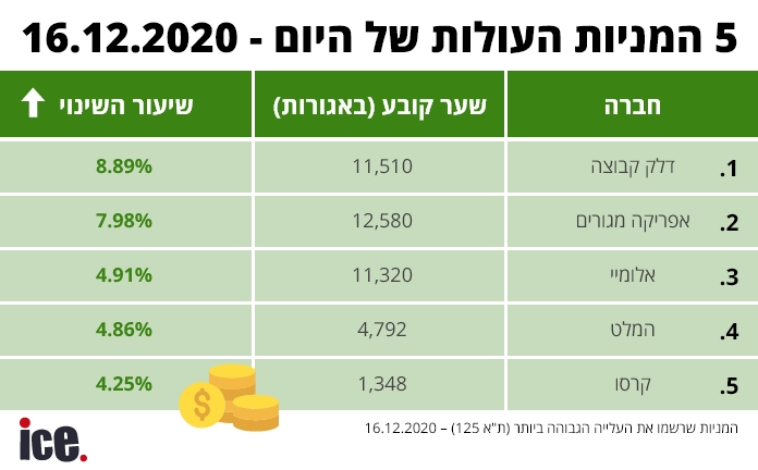 בקטגוריית המניות העולות, קבוצת דלק במקום הראשון עם עלייה של 8.89% לאחר שהודיעה על גיוס של 37 מיליון שקל במניות. במקום השני, אפריקה מגורים שרשמה זינוק של 7.98% ונסגרה בשער של 12,580 אג'. אלומיי במקום השלישי עם עלייה של 4.91%, לשער של 11,320 אג'. המלט במקום הרביעי עם עלייה של 4.86% לשער של 4,792 אג'. קרסו סוגרת את הרשימה הירוקה עם עלייה של 4.25% ושער של 1,348 אג'.