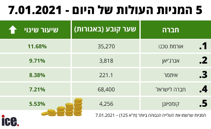 בקטגוריית המניות העולות אורמת טכנו נועלת את השער עם עלייה של 11.68% והציגו שער של 35,270 אג'. מניית אנרג'יאן נמצאת במקום השני עם עלייה של 9.71% לשער של 3,818 אג'. איתמר במקום השלישי לאחר שהוסיפה לשוויה עוד 8.38% ונסגרה בשער של 221.1 אג'. סוגרות את הרשימה חברה לישראל עם עלייה של 7.21% ושער של 68,400 אג' ואחרונה היא קומפיוגן עם עלייה של 5.53% ו-4,256 אג'.