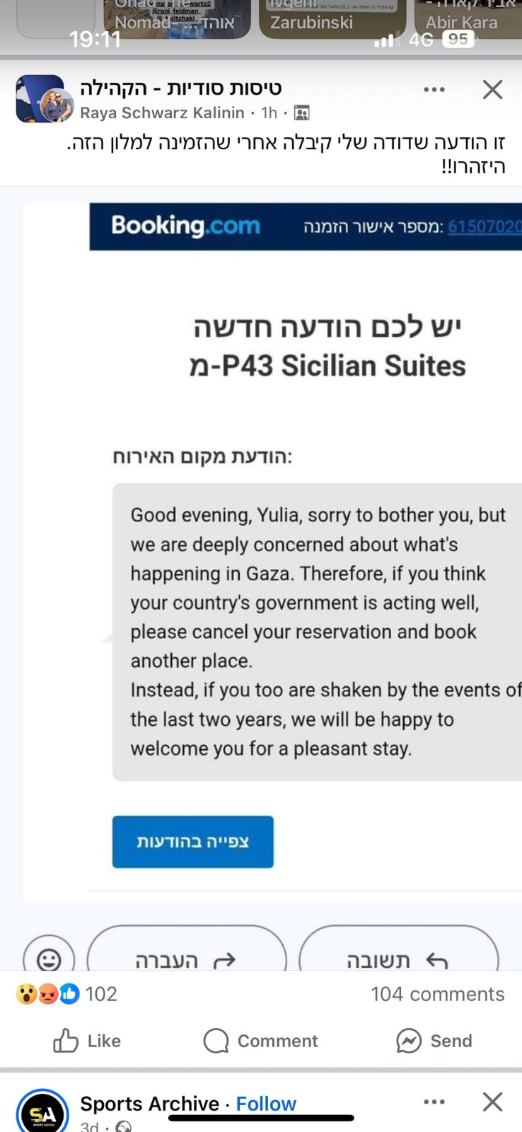 בהודעה שנשלחה אל אותה ישראליות דרך אתר Booking ובפורסמה בקבוצת הפייסבוק הפופלארית 'טיסות סודיות - הקהילה' נכתב: "ערב טוב יוליה, מצטערים להטריד אותך אבל אנחנו מודאגים מאוד ממה שקורה ברצועת עזה".