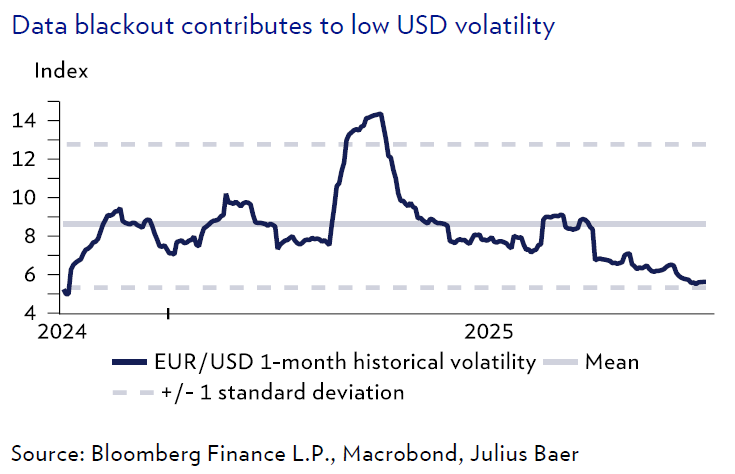 תהליך ההתכנסות של הדולר נמשך, כאשר התחזקות נוספת בשבוע שעבר דחפה את הצמד יורו/דולר לרמה של 1.15. עם חזרת מידה מסוימת של אמון בנכסים אמריקניים, הדולר נהנה מתקופת ה"עמימות הנתונית", ומציג תנודתיות נמוכה במיוחד.