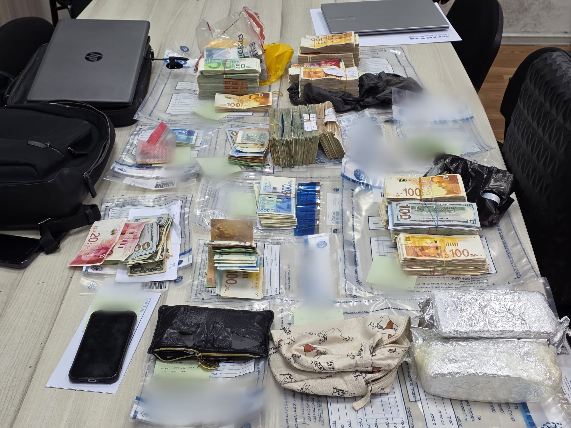 במהלך החיפוש איתרו הכוחות ממצאים רבים, בהם:️ כסף מזומן בסך 555,580 שקל,️ מטבע זר (יורו) בסך 76,085, מטבע זר (דולר) בסך 133,317, 19 מדליוני זהב במשקל כולל של 945 גרם, 56 צ'קים בסכום כולל של 2,556,560 שקל, רכב מסוג BMW X6, מכונה לספירת כסף, טלפונים סלולריים ומחשב נייד.