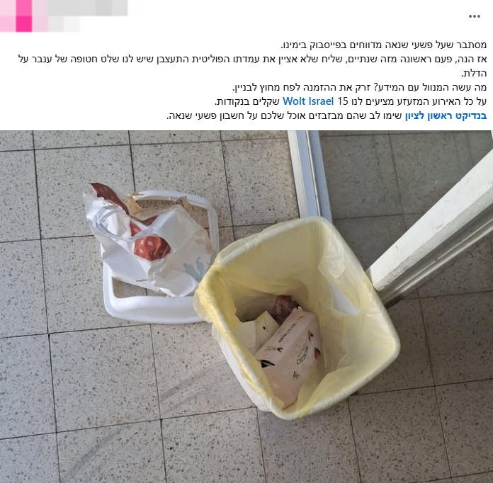אל הפוסט שהעלה לחשבון הפייסבוק שלו, צירף הלקוח את התמונה של ההזמנה בתוך פח הזבל וכתב: "מסתבר שעל פשעי שנאה מדווחים בפייסבוק בימינו. אז הנה, פעם ראשונה מזה שנתיים, שליח של וולט שלא אציין את עמדתו הפוליטית התעצבן שיש לנו שלט חטופה של ענבר על הדלת. מה עשה המנוול עם המידע? זרק את ההזמנה לפח מחוץ לבניין".