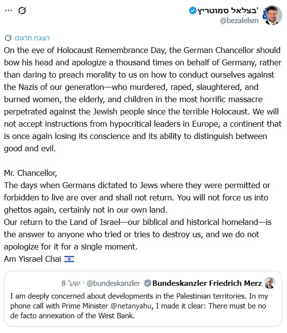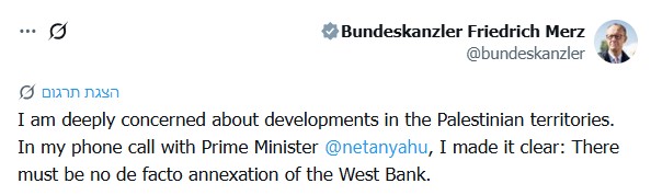 אמש (שני) בערב יום השואה, קנצלר גרמניה, פדריך מרץ התייחס בחשבון ה-X שלו לשיחת הטלפון שלו עם ראש ממשלת ישראל, בנימין נתניהו לגבי סיפוח השטחים הפלסטיניים.