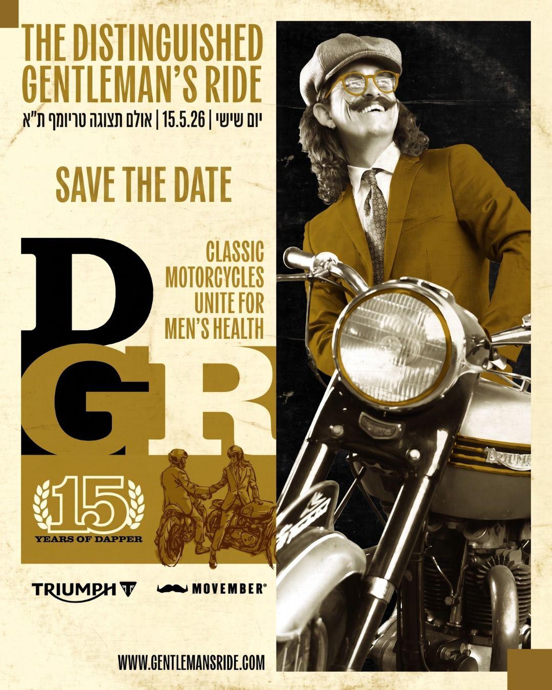 רכיבת הג’נטלמנים (Distinguished Gentleman’s Ride) חוזרת לתל אביב ותתקיים ב-15 במאי, במקביל לאירועים דומים ביותר מ-1,000 ערים בעולם. האירוע, הנערך בשיתוף עמותת Movember ובחסות טריומף, נועד להעלות מודעות ולגייס תרומות לבריאות הגבר, בדגש על סרטן הערמונית ובריאות הנפש.