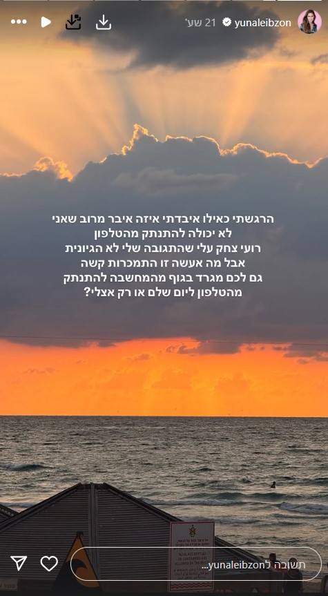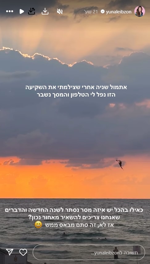 "שניה אחרי שצילמתי את השקיעה הזו, נפל לי הטלפון והמסך נשבר. כאילו בהכל יש איזה מסר נסתר לשנה החדשה והדברים שאנחנו צריכים להשאיר מאחור, נכון? אז לא, זה סתם מבאס ממש", כתבה יונה לייבזון.