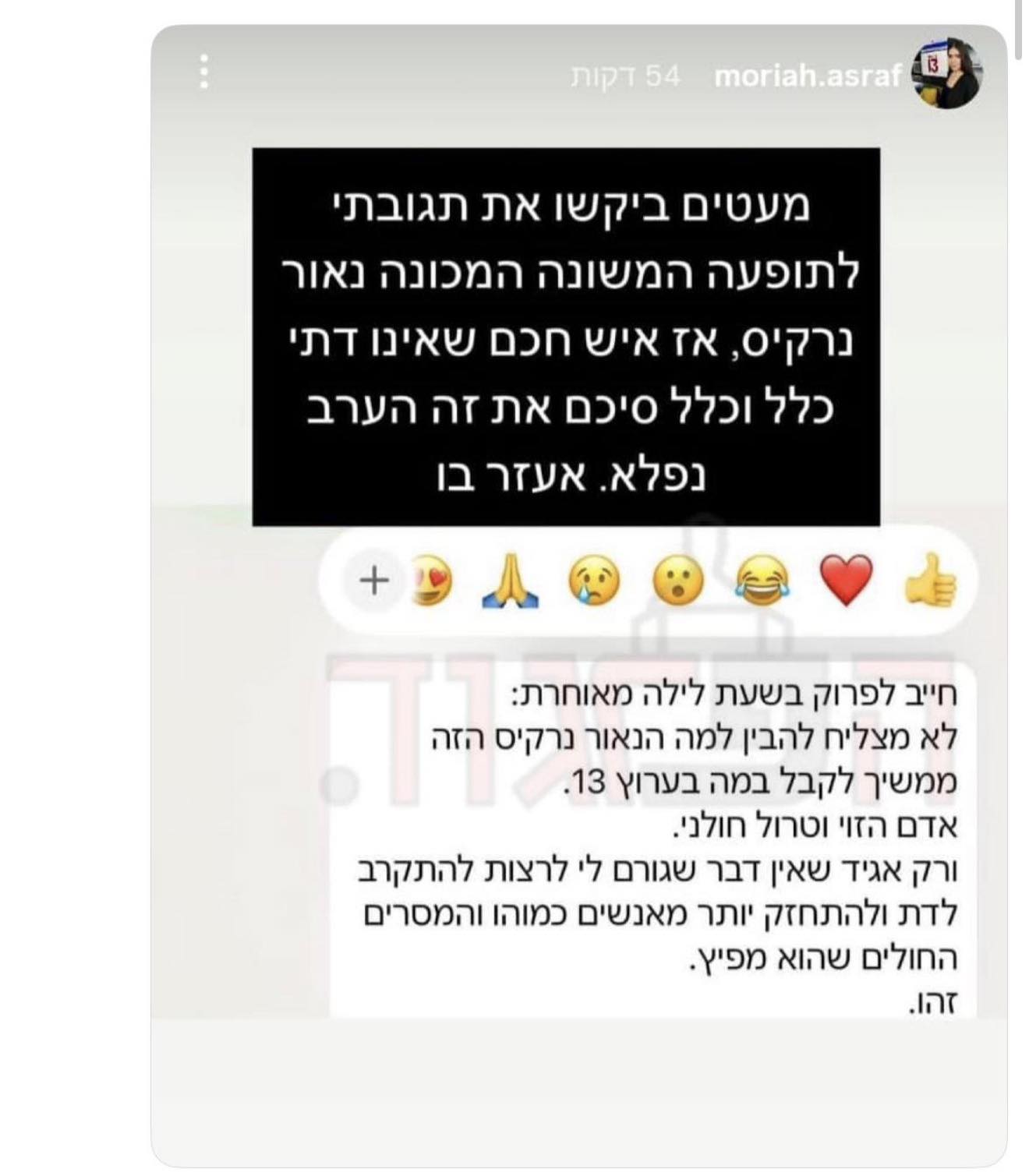 נרקיס לא נשאר חייב לסטורי אותו פרסמה המגישה ופרסם פוסט משלו: "סליחה שבאמצע הלילה אבל לא עובר על הסטורי של מוריה אסרף בשתיקה. למוריה אסרף אין טיעונים רציניים במענה לשאלתי מדוע נשים דתיות צריכות לקבל פטור מצבא וחילוניות לא, אז היא פנתה בסטורי שלה לקללות: 1. נאור נרקיס תופעה משונה 2. אדם הזוי וטרול חולני וקינחה בכך שמצוות דת, הן לא קשורות לאלוהים אלא התרסה נגד חילונים. לשפה כזו של קללות פונה רק אדם שאין לו טיעונים ואין לו מה לומר".