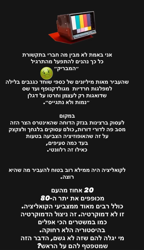 "20 אחוז מהעם כופפים את יתר ה-80 כולל רבים מאוד ממצביעי הקואליציה. זו לא דמוקרטיה, זה ניצול הדמוקרטיה כמו במשטרים הכי אפלים בהיסטוריה הלא רחוקה. מי יגלה להם שזה לא גשם, הדבר הזה שמטפטף להם על הראש?".