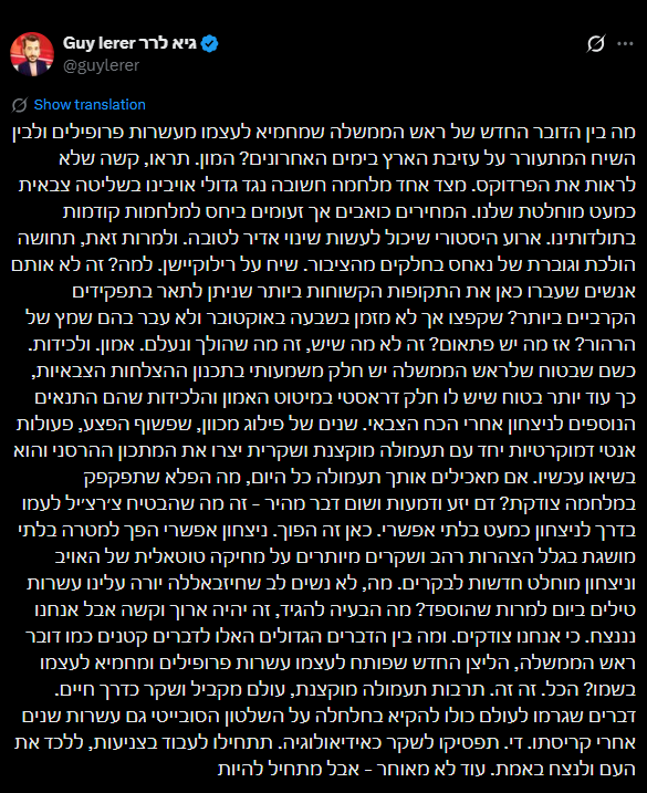 על החשיבה של חלק מהציבור לעזוב את ישראל ועל מדינת ישראל מאז ה-7 באוקטובר: "שיח על רילוקיישן. למה? זה לא אותם אנשים שעברו כאן את התקופות הקשוחות ביותר שניתן לתאר בתפקידים הקרביים ביותר? שקפצו אך לא מזמן בשבעה באוקטובר ולא עבר בהם שמץ של הרהור? אז מה יש פתאום? זה לא מה שיש, זה מה שהולך ונעלם. אמון. ולכידות. כשם שבטוח שלראש הממשלה יש חלק משמעותי בתכנון ההצלחות הצבאיות, כך עוד יותר בטוח שיש לו חלק דראסטי במיטוט האמון והלכידות שהם התנאים הנוספים לניצחון אחרי הכח הצבאי".