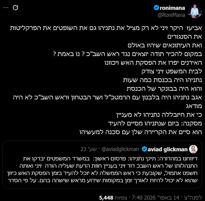 ברקע הדיווח המדובר, איש העסקים רוני מאנה, ממבקריו החריפים של רה"מ נתניהו, מיהר לשתף בעמדתו בנושא. בציוץ שפרסם בחשבון ה-X שלו, מאנה התייחס לדיווח של העיתונאי הוותיק וכתב: "אביעד היקר, זיני לא רק מציל את נתניהו, אלא גם את השופטים את הפרקליטות את הסנגורים ואת העיתונאים שיהיו באולם. במקום להכיר תודה יוצאים נגד ראש השב״כ? נו באמת?".