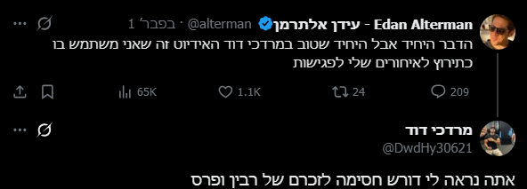 בחודש פבוראר האחרון, העלה אלתרמן בחשבון ה-X (טוויטר לשעבר) פוסט לעג לפעיל הימין השנוי במחלוקת: "הדבר היחיד אבל היחיד שטוב במרדכי דוד האידיוט זה שאני משתמש בו כתירוץ לאיחורים שלי לפגישות" ומרדכי לא נשאר חייב וענה: "אתה נראה לי דורש חסימה לזכרם של רבין ופרס".