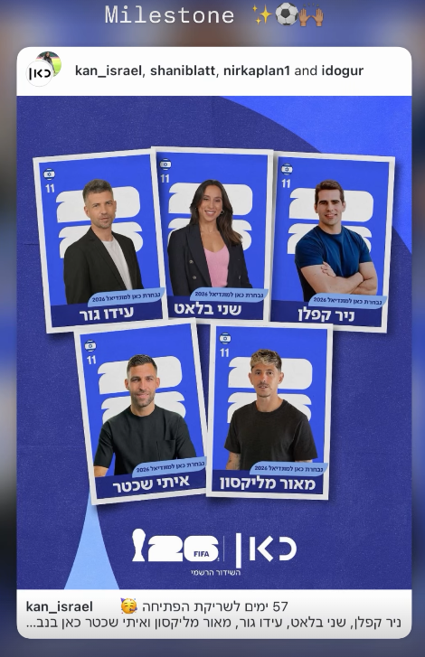 "ניר קפלן, שני בלאט, עידו גור, מאור מליקסון ואיתי שכטר כאן בנבחרת שלנו למונדיאל 2026", נכתב בהודעה שפרסמו כאן 11 ברשתות החברתיות.