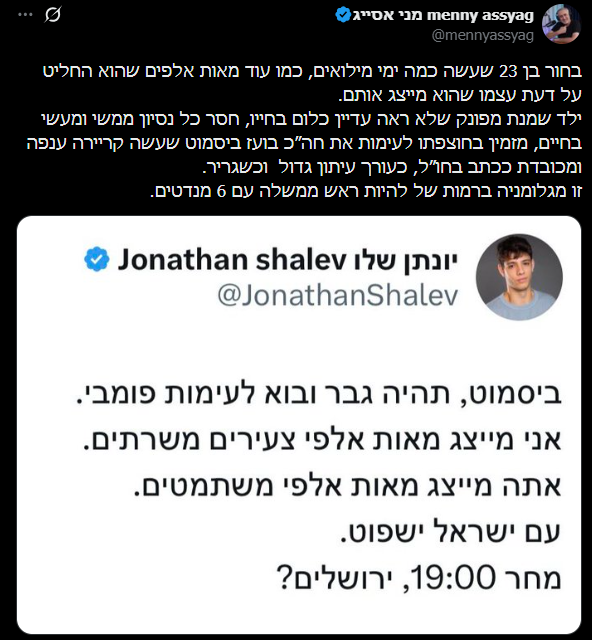 יונתן שלו לא נשאר חייב והגיב ואף הציע לו עימות: "ביסמוט, תהיה גבר ובוא לעימות פומבי. אני מייצג מאות אלפי צעירים משרתים. אתה מייצג מאות אלפי משתמטים. עם ישראל ישפט. מחר, 19:00, ירושלים?".