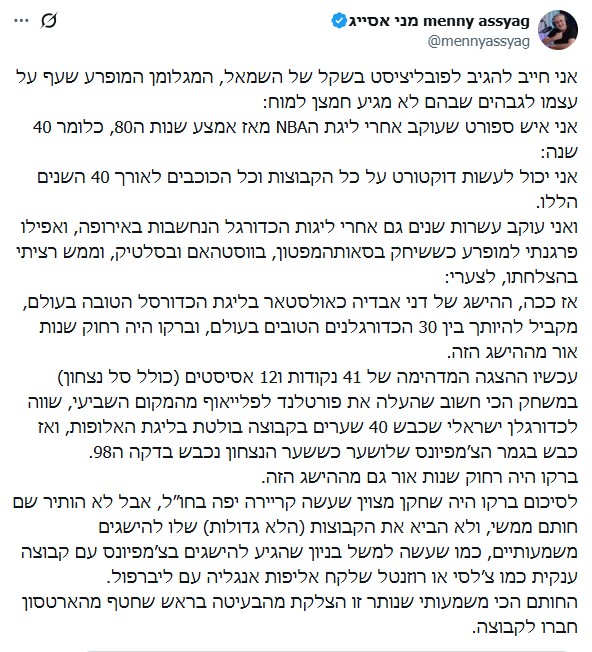 מי שהגיב על דבריו של ברקו הוא התסריטאי מני אסייג שלא נשאר חייב. "אני חייב להגיב לפובליציסט בשקל של השמאל, המגלומן המופרע שעף על עצמו לגבהים שבהם לא מגיע חמצן למוח", כתב בחשבון ה-X שלו, "אני איש ספורט שעוקב אחרי ליגת הNBA מאז אמצע שנות ה-80, כלומר 40 שנה. אני יכול לעשות דוקטורט על כל הקבוצות וכל הכוכבים לאורך 40 השנים הללו".