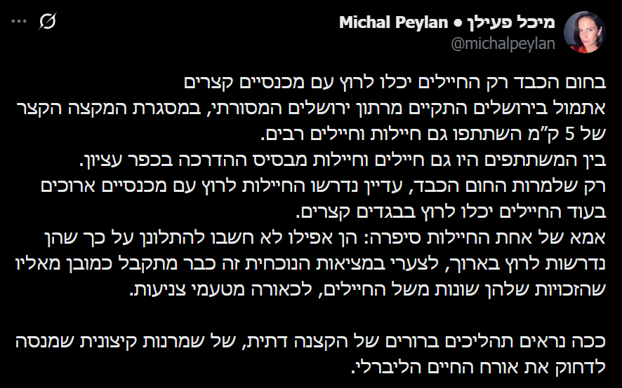 בציוץ שפרסמה בחשבון ה-X, העיתונאית המוכרת סיפרה בהרחבה על האירוע: "בחום הכבד רק החיילים יכלו לרוץ עם מכנסיים קצרים אתמול בירושלים התקיים מרתון ירושלים המסורתי, במסגרת המקצה הקצר של 5 ק״מ השתתפו גם חיילות וחיילים רבים.