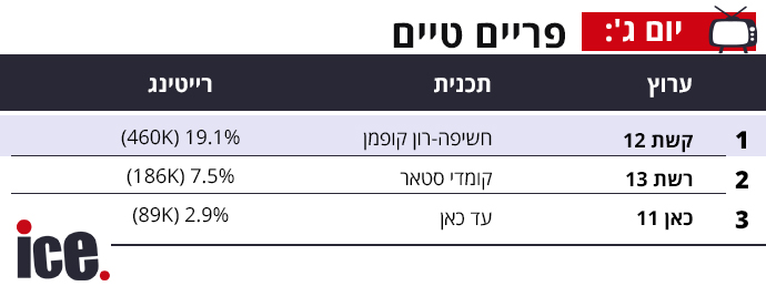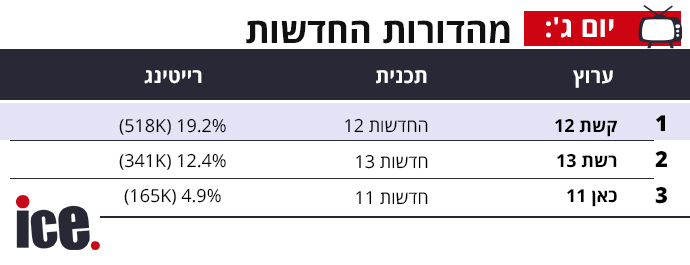 עם זאת, החדשות 12 של קשת עדיין מובילה בבטחה כשהמהדורה המרכזית עם דני קושמרו מחזיקה שוב בתואר התוכנית הנצפית של הערב עם 19.2% ו-518 אלף צופים.