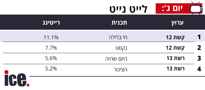 הראיון עם קופמן מספק מקפצה אדירה עבור הלייט נייט בקשת, וחי בלילה נהנית מזה ושומרת על מספרים דו ספרתיים (11.1%). גם נקסט, שסוגרת את הערב, משיגה נתון מרשים של 7.7%.