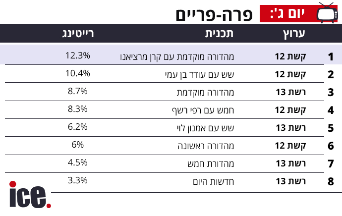 רשת ממשיכה לטפס לקראת 20:00, והמהדורה המוקדמת שלה מספקת כבר 8.7% צפייה מול 12.3% של המהדורה המוקדמת בקשת עם קרן מרציאנו.