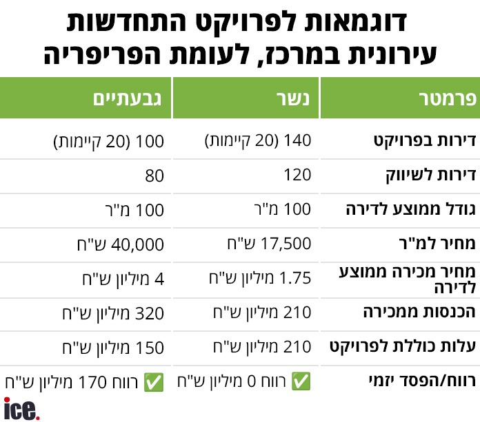 שני פרויקטים, אחד בנשר ואחד בגבעתיים. בפריפריה התמריץ ליזם גדול והוא יבנה מגדלים, בגבעתיים אין תמריץ וייבנו פחות דירות. צלילה לתוך המספרים תבהיר מה הרווח של היזם ולמה הקבלנים מצביעים ברגליים כשמדובר בפרויקט בפריפריה