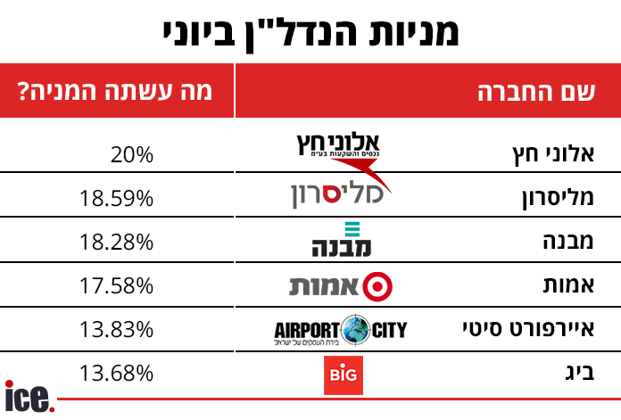 אז מה קרה ביוני למניות של 6 חברות הנדל"ן הגדולות? החברות שבדקנו הן הגדולות - ביג, אלוני חץ, מבנה, מליסרון, איירפורט סיטי ואמות. חברת ביג פתחה לאחרונה את המרכז המסחרי הענק בגלילות והיא מתחילה לאיים על מליסרון, שמדורגת אחרי עזריאלי בשליטה על הנדל"ן המניב.