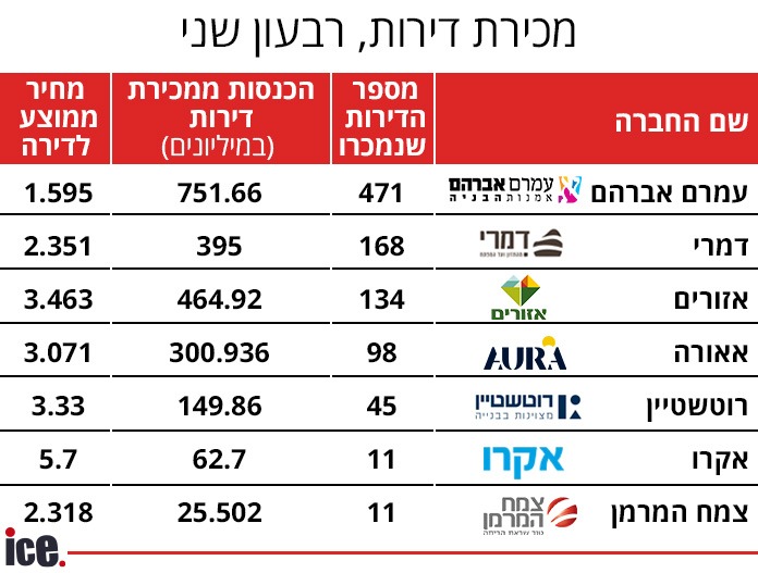בעקבות המצב, בדקנו את הדוחות הכספיים של מספר חברות - כדי להבין בכמה נמכרה דירה ממוצעת ובעיקר - כמה דירות הן מכרו ברבעון האחרון. בכל החברות נרשמה ירידה במכירות, אבל בחלק מהן היא מורגשת היטב, כיוון שמדובר במספר דו ספרתי נמוך במיוחד. הנה התוצאות: